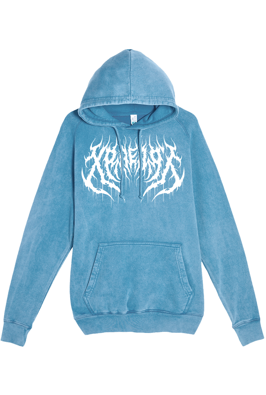 Our SLEEP TIGHT design on a soft and comfortable hoodie featuring our oversized print horned demon succubus woman with horns and a snake. Made with high-quality materials, this hoodie is perfect for those who appreciate original dark art and want to make a bold statement. Printed in white ink on a blue vintage wash hoodie. Front print features our brand name XRAEART in a custom drawn metal font.