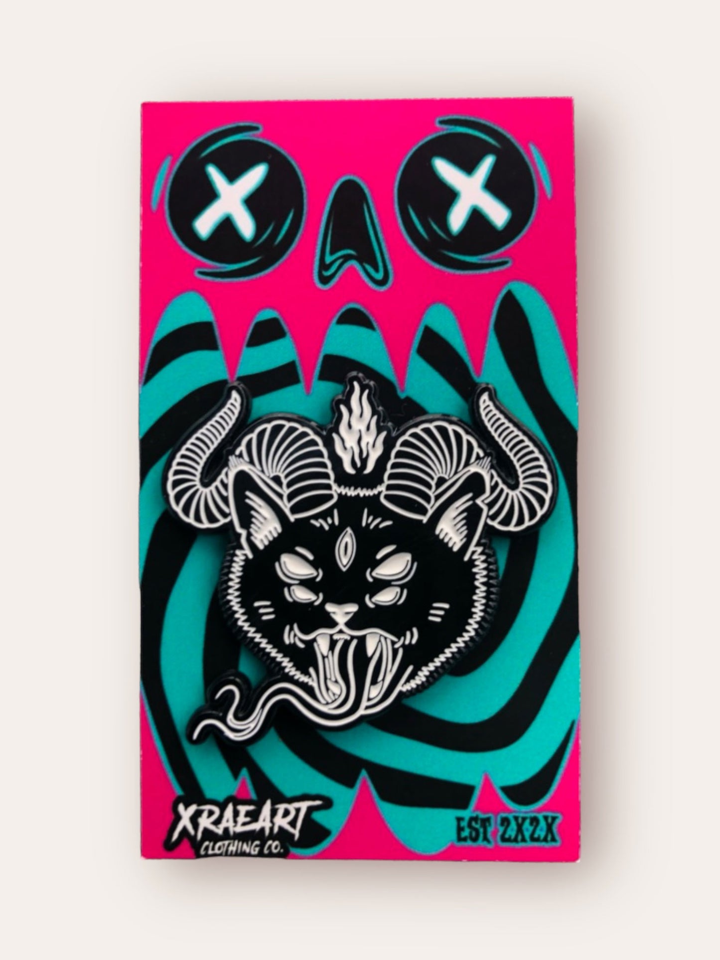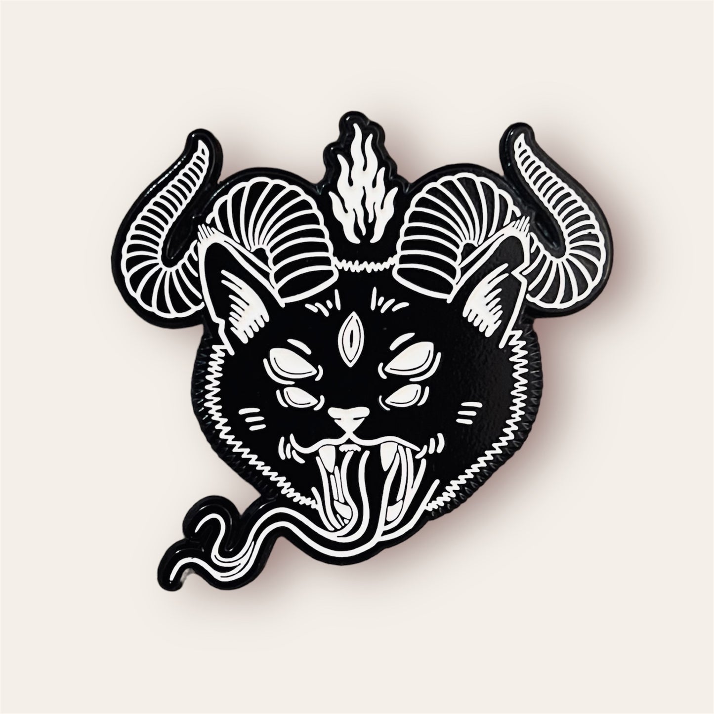 Our DEMON PUSSY Enamel Pin is a purr-fectly wicked way to add a little devilish charm to your wardrobe. At 1 3/4-inches wide, it makes a bold statement, and its black-dyed finish and two rubber attachments hold it firmly in place. Don't worry – no nine lives were harmed in the making of this pin! Comes on our spiral mouth monster backer card.