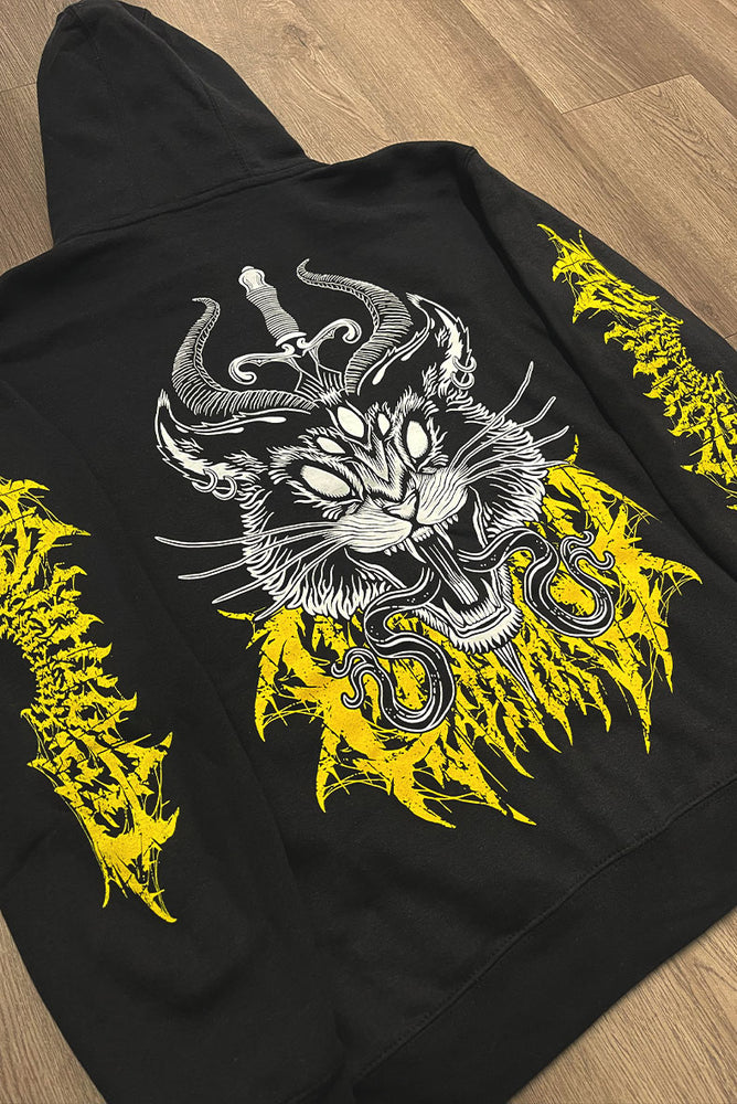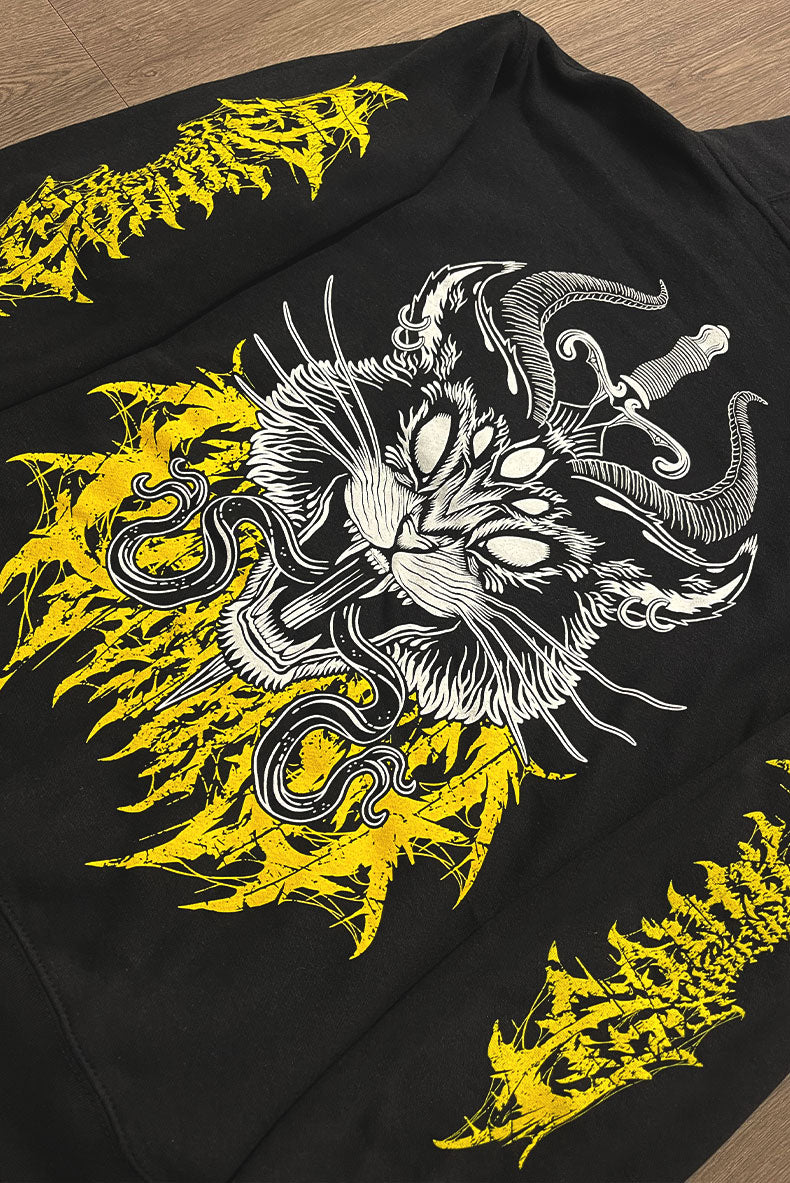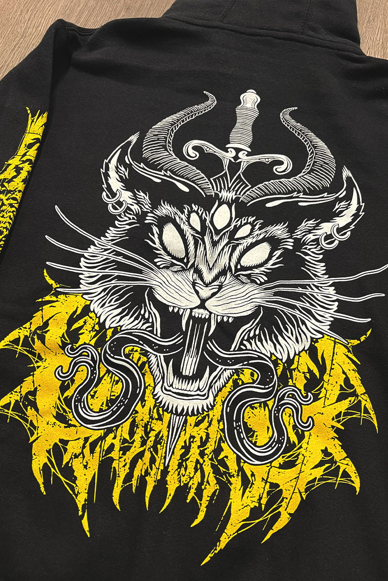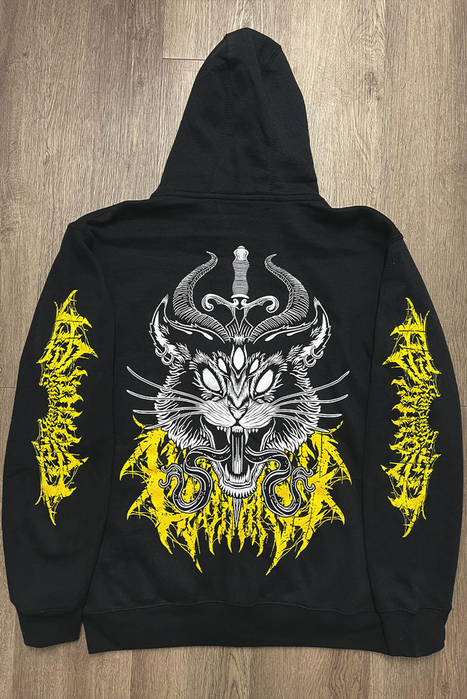 Our 9 LIES Hellcat hoodie showcases our original demonic black cat design with a sword stabbing through its head to create split tongues, expertly screen-printed on high-quality cotton fleece. The metal typography printed in vibrant, golden yellow is slightly hidden behind the design on the back and printed on the sleeves, says "Xraeart Clothing".