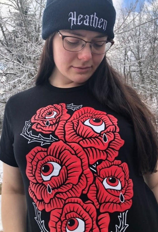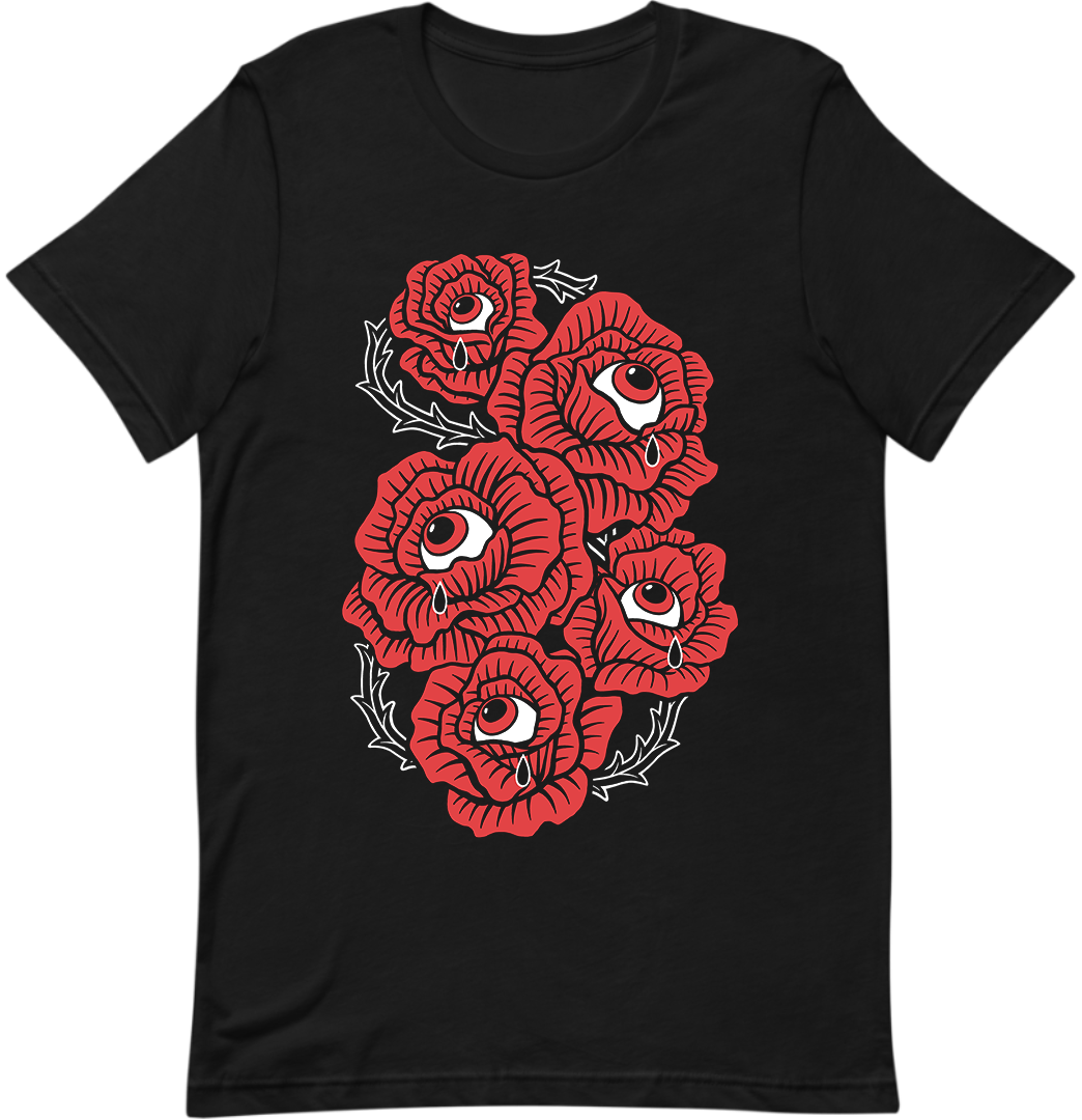 Our exclusive budding romance graphic is an ode to the classic bold tattoo style, with crying eyeball roses and sharp black thorns 🥀 Nothing is better than a classic design in red, black and white 💀